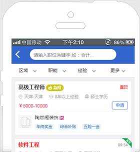- 海量工作機會等著您,同一時刻您將面對數(shù)以十萬的工作機會;幫助您記憶最近搜索條件,簡化您的搜索操作。